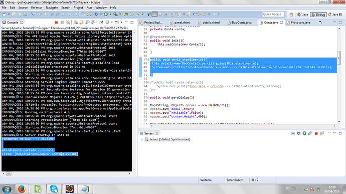 Preciso enviar como parametro o valor de uma coluna do meu dataTable da pagina principal para meu Bean, filtrar na query da minha classe Dao e retornar para o atributo atendimento_retorno da lista details( variaveis do meu Bean). Para um pop-up com outro datatable que seja carregado, porém ele está vindo null e não entendo porque já pesquisei, tentei usar dialog e pedi para imprimir em alguns pontos para identificar até onde o parametro está chegando, notei que está indo até a classe Dao o valor, o problema parece estar no list. Segue abaixo o meu código se alguém puderem dar uma olhada…