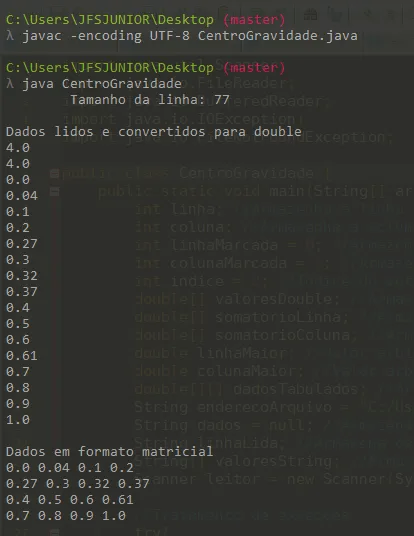 Para cada caractere deverá mostrar na tela a linha e a coluna correspondente ao centro de gravidade. Se