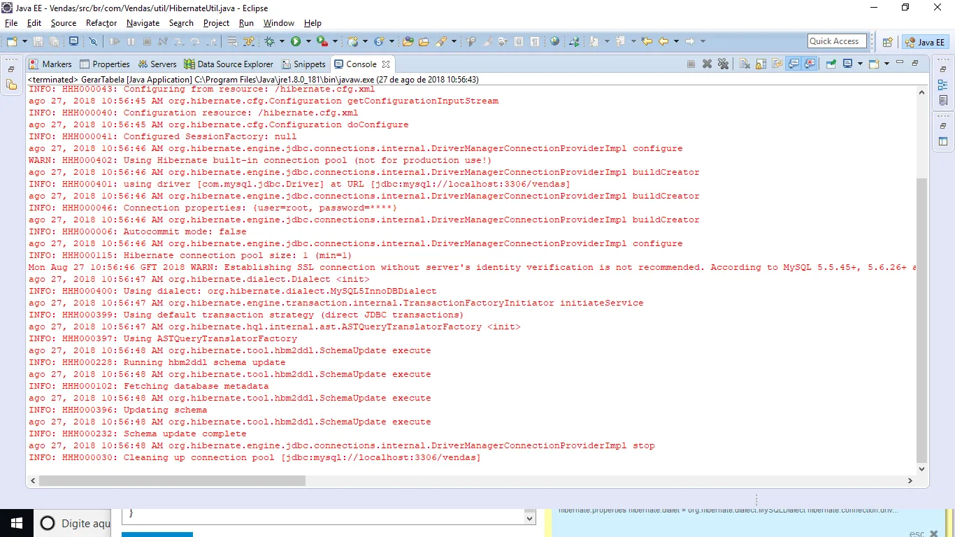 Boa tarde amigos estou estudando Java Web e um dos exercícios teste que estou fazendo estou tentando criar as tabelas no banco de dados pelo Hibernate.
