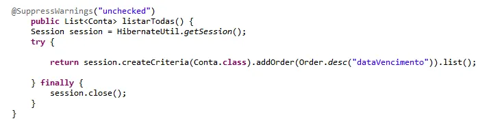 return session.createCriteria(Conta.class).addOrder(Order.desc("dataVencimento")).list();