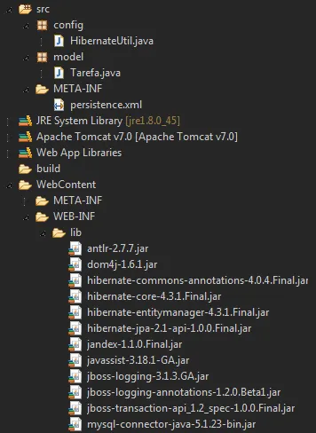 <persistence xmlns="http://java.sun.com/xml/ns/persistence" xmlns:xsi="http://www.w3.org/2001/XMLSchema-instance" xsi:schemaLocation="http://java.sun.com/xml/ns/persistence http://java.sun.com/xml/ns/persistence/persistence_2_0.xsd" version="2.0"> <persistence-unit name="tarefas">org.hibernate.ejb.HibernatePersistence