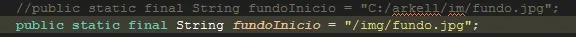 Sendo que na minha classe Constante, que instanciei com o nome c, eu tinha uma String chamada fundoInicio que recebia o local “/img/fundo.jpg”, por isso concatenei c.fundoInicio