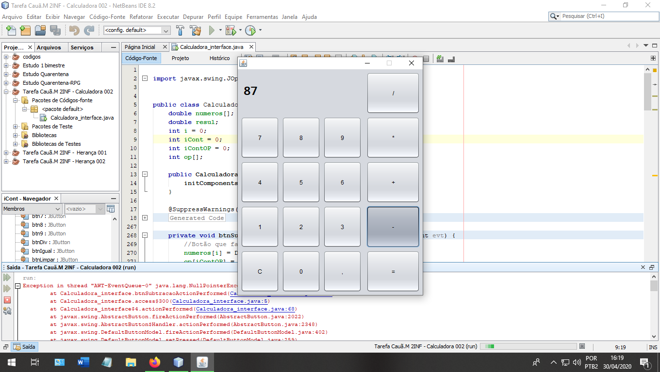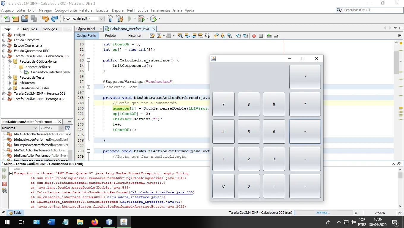 sempre que eu abro a interface gráfica do programa, não tem problemas quando digito um numero ou a vírgula, quando eu limpo a tela (botão C das calculadoras normais) ou o igual não da problema nenhum, mas quando eu aperto em qualquer botão de operação da um erro.