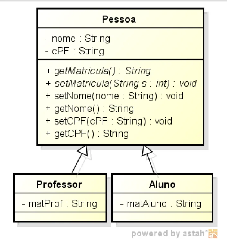Porém os métodos estão sendo identificados como abstratos, métodos estes setMatricula(String s:Int):void e +getMatricula():String.