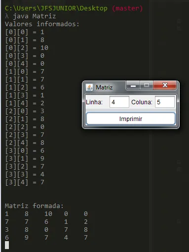 Bloco de Citação private void mat1() { int M[][] = new int[4][4]; for(int i=1;i<=3;i++) { for(int ia=1;ia<=3;ia++) { M[i][ia]=ia; } } private void jButton1ActionPerformed(java.awt.event.ActionEvent evt) { for(int i=1;i<=3;i++) { for(int ia=1;ia<=3;ia++) { System.out.print(" " + M[i][ia]); } System.out.println(" "); } } Bloco de Citação