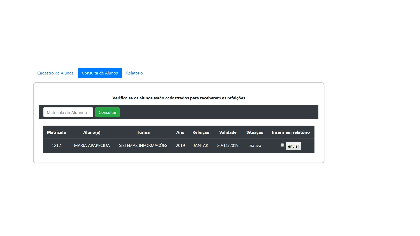 | Matrícula | Nome | Turma | Ano | Refeição |