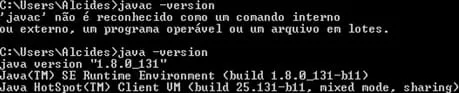 No instante de confirmar a versão do “javac”, retornou erro, mas, por outro lado, para a versão do Java, ocorreu tudo bem