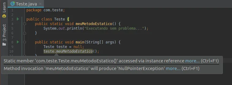 Mas no IntelliJ, quando tenta invocar um método estático de um objeto null ele lança um inspection warning afirmando que essa invocação irá produzir NullPointerException: