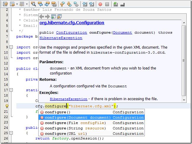 Vi também que existe a documentação do Hibernate na pasta que extrai. Haveria uma forma de colocar junto com a documentação do Java? Não sei se influenciaria, mas percebi que não aparece uma descrição dos métodos que uso do Hibernate como aparecem nos métodos que uso do Java.