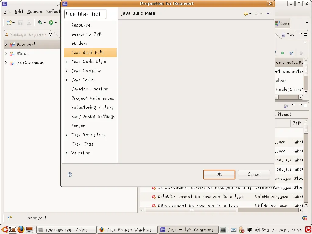 Acerta no arquivo .classpath, na raiz do seu projeto. Abra o arquivo usando um editor de textos, como o GEdit, por exemplo.