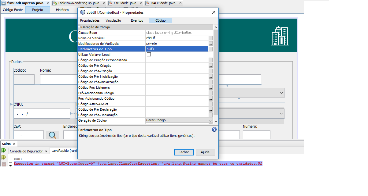 Exception in thread “AWT-EventQueue-0” java.lang.ClassCastException: java.lang.String cannot be cast to entidades.Uf