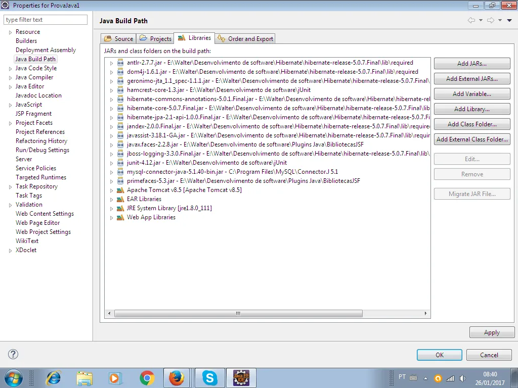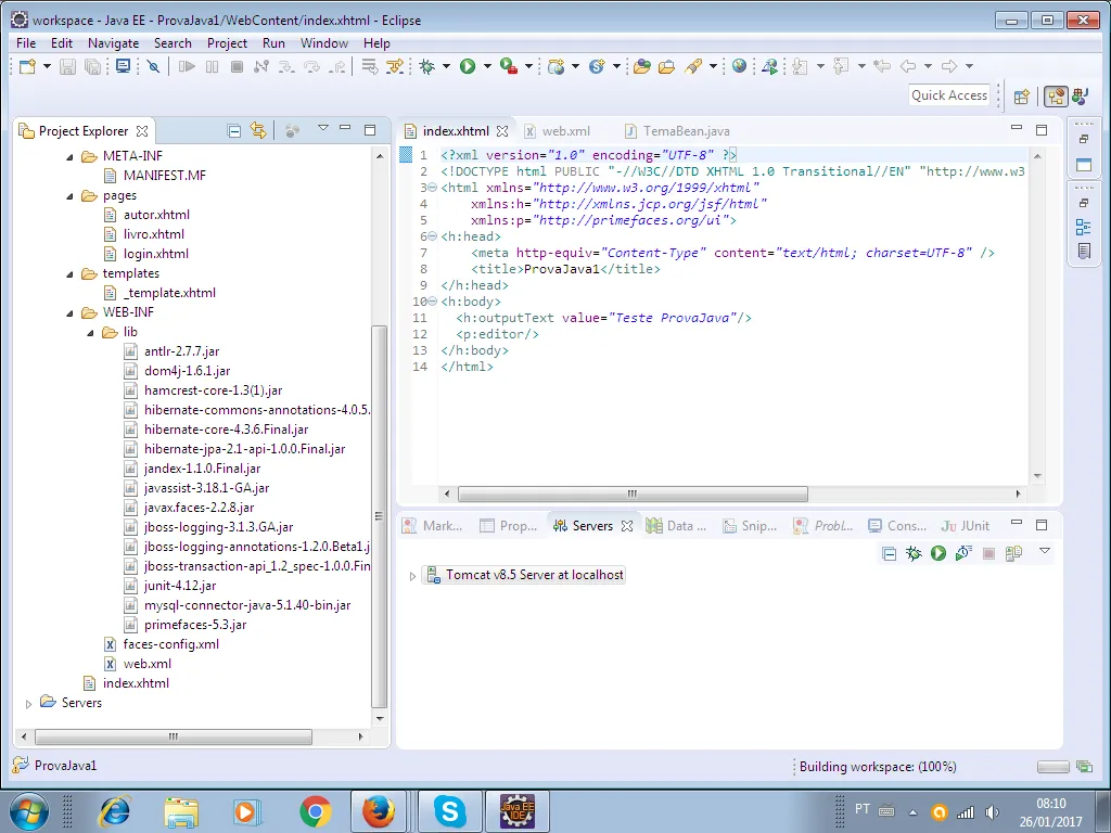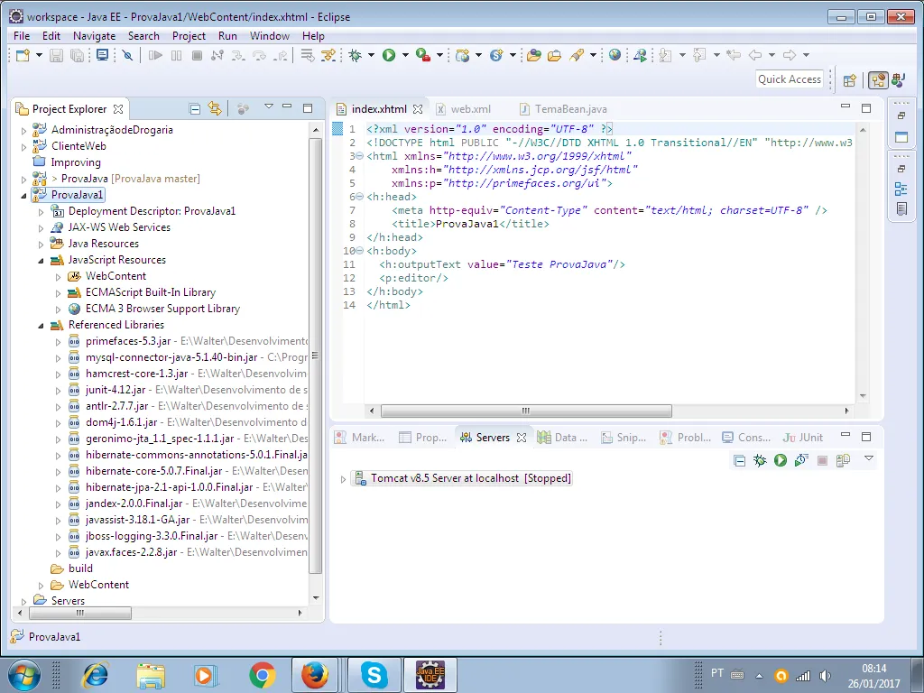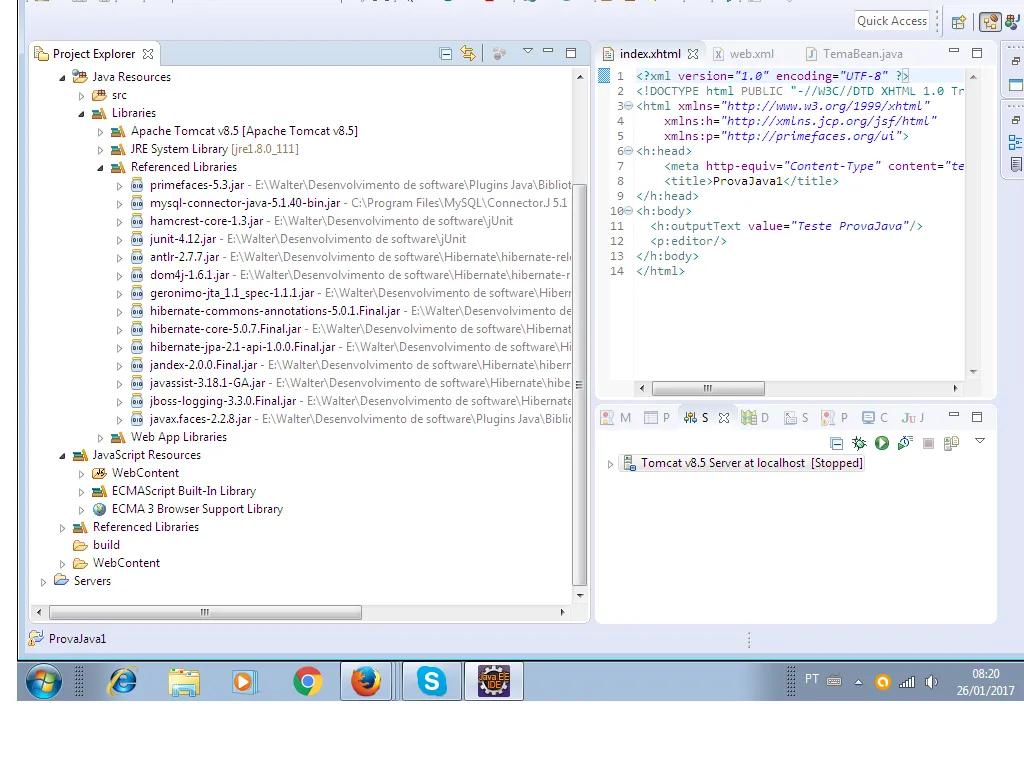 jan 26, 2017 12:53:04 AM org.apache.tomcat.util.digester.SetPropertiesRule begin ADVERTÊNCIA: [SetPropertiesRule]{Server/Service/Engine/Host/Context} Setting property ‘source’ to ‘org.eclipse.jst.jee.server:AdministraçãodeDrogaria’ did not find a matching property. jan 26, 2017 12:53:04 AM org.apache.tomcat.util.digester.SetPropertiesRule begin ADVERTÊNCIA: [SetPropertiesRule]{Server/Service/Engine/Host/Context} Setting property ‘source’ to ‘org.eclipse.jst.jee.server:ProvaJava’ did not find a matching property. jan 26, 2017 12:53:04 AM org.apache.tomcat.util.digester.SetPropertiesRule begin ADVERTÊNCIA: [SetPropertiesRule]{Server/Service/Engine/Host/Context} Setting property ‘source’ to ‘org.eclipse.jst.jee.server:ProvaJava1’ did not find a matching property. jan 26, 2017 12:53:04 AM org.apache.catalina.startup.VersionLoggerListener log INFORMAÇÕES: Server version: Apache Tomcat/8.5.9 jan 26, 2017 12:53:04 AM org.apache.catalina.startup.VersionLoggerListener log INFORMAÇÕES: Server built: Dec 5 2016 20:18:12 UTC jan 26, 2017 12:53:04 AM org.apache.catalina.startup.VersionLoggerListener log INFORMAÇÕES: Server number: 8.5.9.0 jan 26, 2017 12:53:04 AM org.apache.catalina.startup.VersionLoggerListener log INFORMAÇÕES: OS Name: Windows 7 jan 26, 2017 12:53:04 AM org.apache.catalina.startup.VersionLoggerListener log INFORMAÇÕES: OS Version: 6.1 jan 26, 2017 12:53:04 AM org.apache.catalina.startup.VersionLoggerListener log INFORMAÇÕES: Architecture: x86 jan 26, 2017 12:53:04 AM org.apache.catalina.startup.VersionLoggerListener log INFORMAÇÕES: Java Home: C:\Program Files\Java\jre1.8.0_111 jan 26, 2017 12:53:04 AM org.apache.catalina.startup.VersionLoggerListener log INFORMAÇÕES: JVM Version: 1.8.0_111-b14 jan 26, 2017 12:53:04 AM org.apache.catalina.startup.VersionLoggerListener log INFORMAÇÕES: JVM Vendor: Oracle Corporation jan 26, 2017 12:53:04 AM org.apache.catalina.startup.VersionLoggerListener log INFORMAÇÕES: CATALINA_BASE: C:\Users\Wltr\workspace.metadata.plugins\org.eclipse.wst.server.core\tmp1 jan 26, 2017 12:53:04 AM org.apache.catalina.startup.VersionLoggerListener log INFORMAÇÕES: CATALINA_HOME: C:\Users\Wltr\Desktop\Desenvolvimento\apache-tomcat-8.5.9 jan 26, 2017 12:53:04 AM org.apache.catalina.startup.VersionLoggerListener log INFORMAÇÕES: Command line argument: -Dcatalina.base=C:\Users\Wltr\workspace.metadata.plugins\org.eclipse.wst.server.core\tmp1 jan 26, 2017 12:53:04 AM org.apache.catalina.startup.VersionLoggerListener log INFORMAÇÕES: Command line argument: -Dcatalina.home=C:\Users\Wltr\Desktop\Desenvolvimento\apache-tomcat-8.5.9 jan 26, 2017 12:53:04 AM org.apache.catalina.startup.VersionLoggerListener log INFORMAÇÕES: Command line argument: -Dwtp.deploy=C:\Users\Wltr\workspace.metadata.plugins\org.eclipse.wst.server.core\tmp1\wtpwebapps jan 26, 2017 12:53:04 AM org.apache.catalina.startup.VersionLoggerListener log INFORMAÇÕES: Command line argument: -Djava.endorsed.dirs=C:\Users\Wltr\Desktop\Desenvolvimento\apache-tomcat-8.5.9\endorsed jan 26, 2017 12:53:04 AM org.apache.catalina.startup.VersionLoggerListener log INFORMAÇÕES: Command line argument: -Dfile.encoding=Cp1252 jan 26, 2017 12:53:04 AM org.apache.catalina.core.AprLifecycleListener lifecycleEvent INFORMAÇÕES: The APR based Apache Tomcat Native library which allows optimal performance in production environments was not found on the java.library.path: C:\Program Files\Java\jre1.8.0_111\bin;C:\Windows\Sun\Java\bin;C:\Windows\system32;C:\Windows;C:/Program Files/Java/jre1.8.0_111/bin/client;C:/Program Files/Java/jre1.8.0_111/bin;C:/Program Files/Java/jre1.8.0_111/lib/i386;C:\ProgramData\Oracle\Java\javapath;C:\Windows\system32;C:\Windows;C:\Windows\System32\Wbem;C:\Windows\System32\WindowsPowerShell\v1.0;C:\Program Files\Skype\Phone;C:\Program Files\Java\bin;E:\Git\cmd;C:\Program Files\MySQL\MySQL Utilities 1.6;C:\Users\Wltr\Desktop;;. jan 26, 2017 12:53:08 AM org.apache.coyote.AbstractProtocol init INFORMAÇÕES: Initializing ProtocolHandler [“http-nio-8080”] jan 26, 2017 12:53:09 AM org.apache.tomcat.util.net.NioSelectorPool getSharedSelector INFORMAÇÕES: Using a shared selector for servlet write/read jan 26, 2017 12:53:09 AM org.apache.coyote.AbstractProtocol init INFORMAÇÕES: Initializing ProtocolHandler [“ajp-nio-8009”] jan 26, 2017 12:53:09 AM org.apache.tomcat.util.net.NioSelectorPool getSharedSelector INFORMAÇÕES: Using a shared selector for servlet write/read jan 26, 2017 12:53:09 AM org.apache.catalina.startup.Catalina load INFORMAÇÕES: Initialization processed in 7026 ms jan 26, 2017 12:53:09 AM org.apache.catalina.core.StandardService startInternal INFORMAÇÕES: Starting service Catalina jan 26, 2017 12:53:09 AM org.apache.catalina.core.StandardEngine startInternal INFORMAÇÕES: Starting Servlet Engine: Apache Tomcat/8.5.9 jan 26, 2017 12:53:21 AM org.apache.jasper.servlet.TldScanner scanJars INFORMAÇÕES: At least one JAR was scanned for TLDs yet contained no TLDs. Enable debug logging for this logger for a complete list of JARs that were scanned but no TLDs were found in them. Skipping unneeded JARs during scanning can improve startup time and JSP compilation time. jan 26, 2017 12:53:23 AM com.sun.faces.config.ConfigureListener contextInitialized INFORMAÇÕES: Inicializando Mojarra 2.2.8 ( 20140814-1418 <a href="https://svn.java.net/svn/mojarra~svn/tags/2.2.8@13507">https://svn.java.net/svn/mojarra~svn/tags/2.2.8@13507</a>) para o contexto '/provajava1’ jan 26, 2017 12:53:24 AM com.sun.faces.spi.InjectionProviderFactory createInstance INFORMAÇÕES: JSF1048: Anotações PostConstruct/PreDestroy presentes. Os métodos ManagedBeans marcados com essas anotações informarão as anotações processadas. jan 26, 2017 12:53:31 AM org.primefaces.webapp.PostConstructApplicationEventListener processEvent INFORMAÇÕES: Running on PrimeFaces 5.3 jan 26, 2017 12:53:38 AM org.apache.jasper.servlet.TldScanner scanJars INFORMAÇÕ