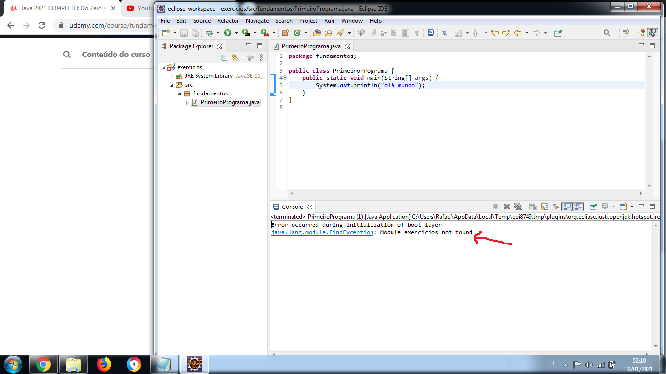 o projeto java “exercicios” aparece no packge explorer do eclipse com um “x” vermelho e quando tento executar “PrimeiroPrograma” a mensagem de erro é essa: java.lang.module.FindException: Module exercicios not found