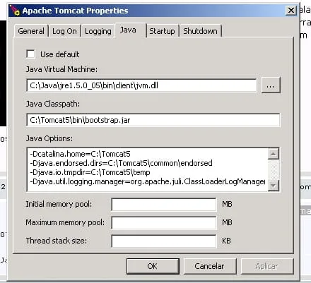 Não sei bem direito o caminho, mas qndo o TomCat e istalado no Windows, se vc for em Iniciar/Programas/Apache Tom Cat/ vai encontrar uma ferramenta de configuração, nesta ferramenta existe uma aba com os parametros que vc tem que passar para JVM.