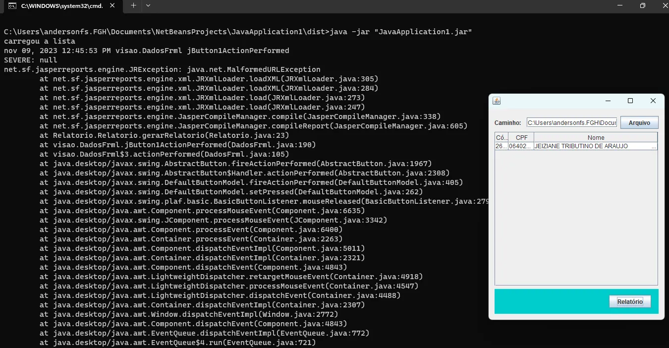 at Relatorio.Relatorio.gerarRelatorio(Relatorio.java:23)