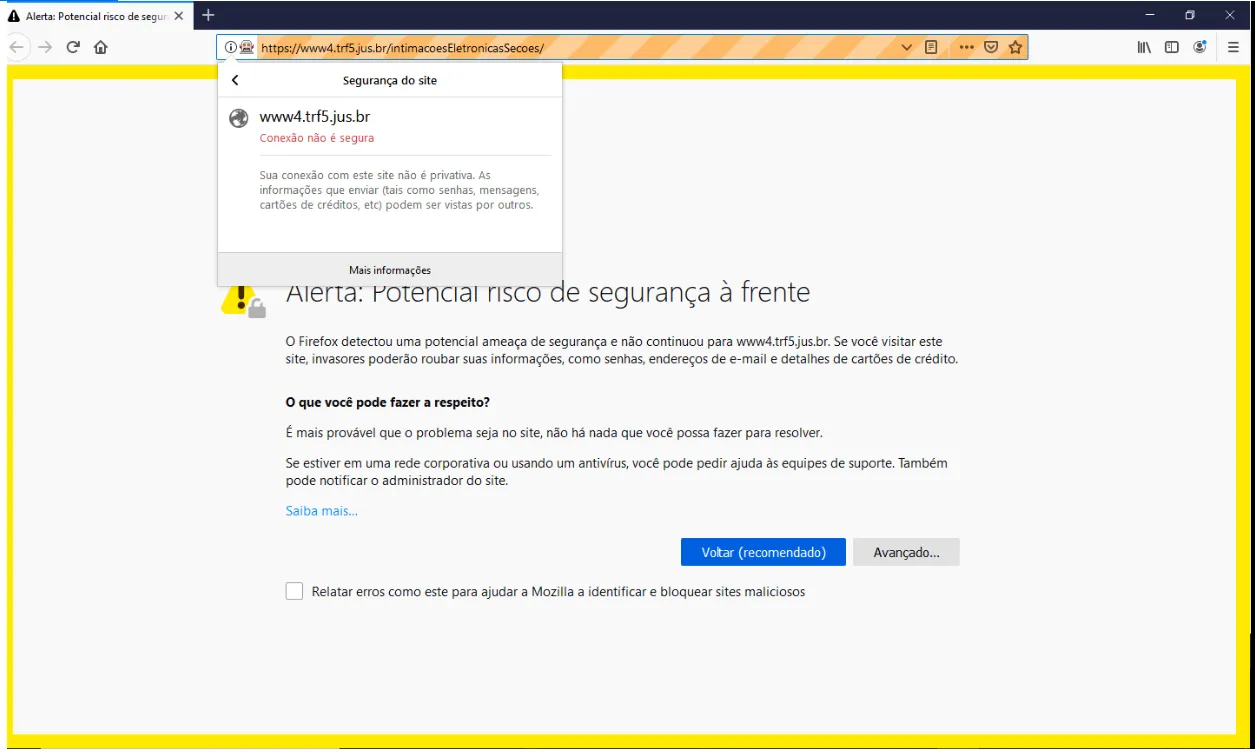 (Só lembrando que diretamente pelo navegador eu acesso normalmente, não cai nessa tela de Alerta) Não testei em outro navegador, pois para este projeto preciso utilizar o FireFox.