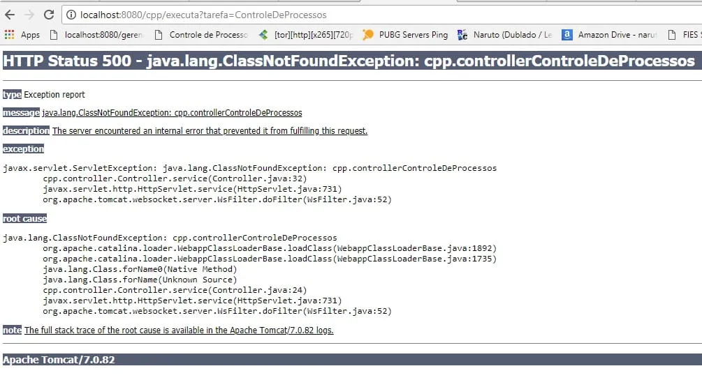 Se alguém puder fazer o favor e de repente dar uma luz eu agradeceria muito, pois já fiz vários testes e não consegui descobrir pq o java lança essa exception dizendo que não acha a Classe ControleDeProcessos.