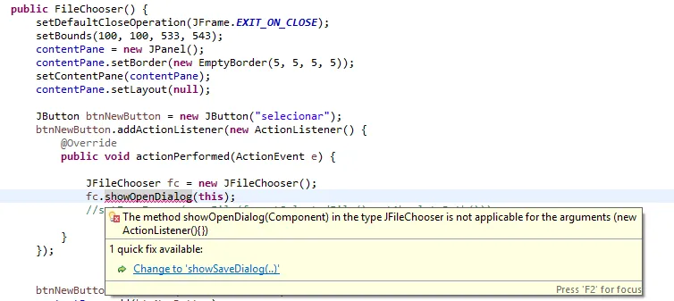 O JFileChooser está sendo executado np escopo do ActionListener, não do JFrame. Então, quando você usa this dentro do new ActionListener(){ , o this se refere ao ActionListener, não ao JFrame que contém o botão.