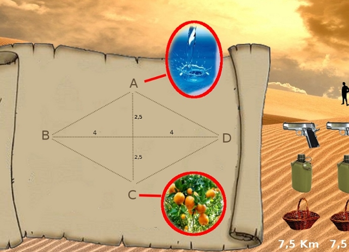 Dois executivos rivais em um negócio não muito legal, viajavam para negociar drogas em uma cidade estrangeira e por coincidência, pegaram um avião que caiu no deserto. Sendo os dois únicos sobrevientes, ambos sabem por um mapa que estão a 8 km de distância da cidade mais próxima. Cada um deles só tem forças para caminhar 7,5 km antes de morrerem de fome ou desidratados. Pelo mapa vemos que no meio do caminho, existe dois caminhos perpendiculares que leva um a água e outro a alimentos, todos suficientes para os dois. Cada um deles possui também: um cantil, uma cesta e uma pistola com uma bala.
