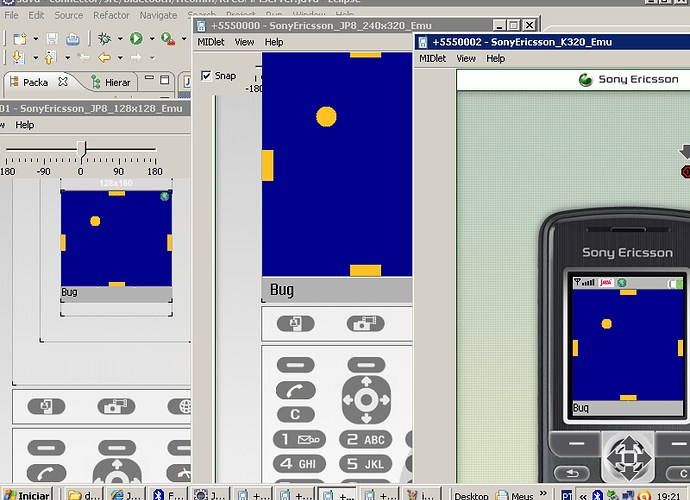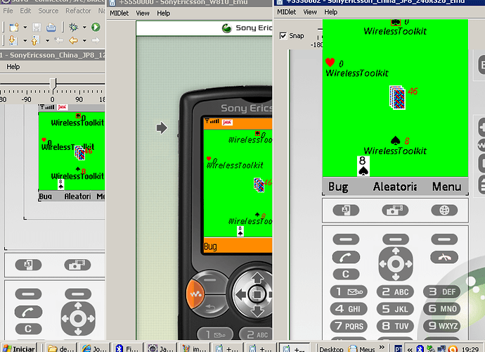 Crie dois jogos multiplayers para dispositivos que suportam Bluetooth. Um jogo é de cartas e o outro é o classico do pong, ou seja, um tijolo que tem que acertar a bola. A diferença porem é que nesse caso pode-se jogar até 4 jogadores e para qualquer formato de celular. Até o momento testei no Nokia 5000,6610,2630,5800, se alguém puder testar irei agradescer bastante. Caso alguém precisar dos fontes, sem problemas, posso mandar!!:lol: