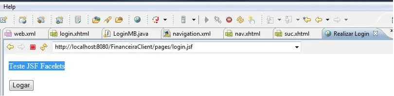 8 - No browser agora ele troca o endereço para http://localhost:8080/FinanceiraClient/pages/suc.jsf (ERRO)