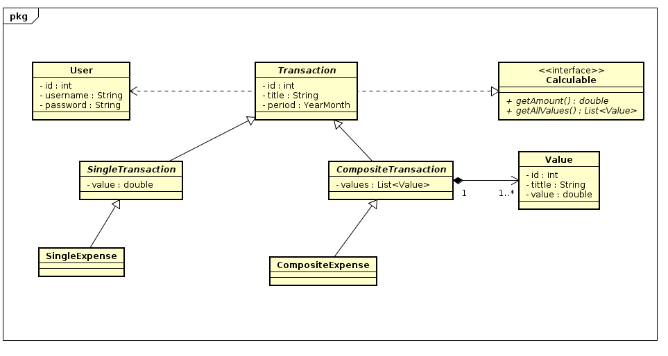 Algo que pensei: Ao invés de existir SingleExpense e CompositeExpense… existiria apenas Expense… e um atributo values sendo um list de Operations. Se uma Expense for simples esse list tem apenas uma linha…se for composta tem N linhas… mas ficaria algo do tipo: