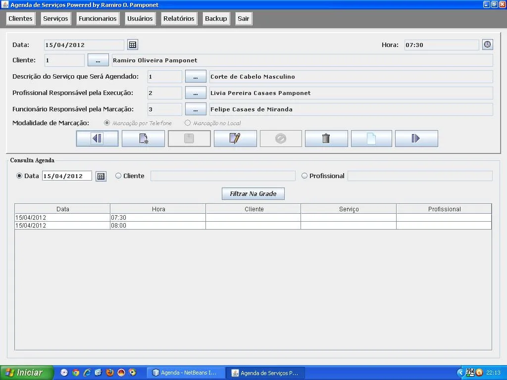 Bem … é o seguinte … Estou desenvolvendo uma aplicação (sob encomenda) para o agendamento se diversos serviços (com data e hora marcada). Graças a DEUS o problema com as Datas eu já solucionei, mas agora estou enfrentando mais um. Possuo em meu banco de dados (PostgreSQL) as seguintes tabelas: clientes, funcionários, servicos, usuarios e agendas. a tabela usuarios possui como chave estrangeira o id dos funcionários e a tabelas agendas possui como chaves estrangeiras os códigos do cliente, do funcionario, do usuario, do serviço. Criei uma tabela para capturar a data, a hora (salvos na tabela agendas) e o nome do cliente, a descrição do serviço e o nome do funcionário que irá executar o serviço, porém esses 3 últimos não estou conseguindo recuperar, preciso de uma ajuda dos colegas mais experientes, pois não tenho a mínima ideia de como fazê-lo. Segue abaixo os códigos da Classe Control (Responsável pelos comandos SQL) …