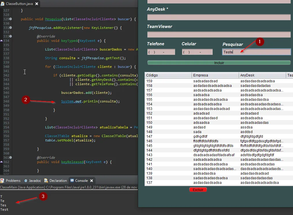 Estou com o seguinte problema. Eu tenho um API onde tem uma um JTextField de pesquisa. Ou seja, no momento que alguém digita alguma informação a minha JTable vai filtrar estas informações para trazer a informação desejada. Fiz um teste com meu Sysout e as informações estão sendo passadas. Segue código e uma print.