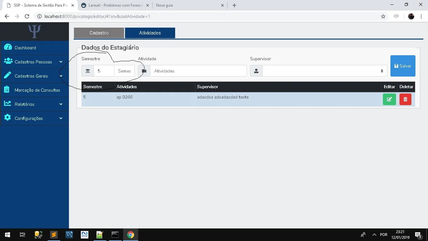 @foreach($EditarAtividadeas$edtatv)<inputtype="text"class="form-control"name="semestre"id="semestre"placeholder="Semestre do estagiário."value="{{$edtatv->atv_semestre}}">@endforeachoutraduvidaqueeutenhoé.sóépossivelexibirosdadosutilizandoforeach?pqnessecasoaíirásempreretornarumúnicoregistro.