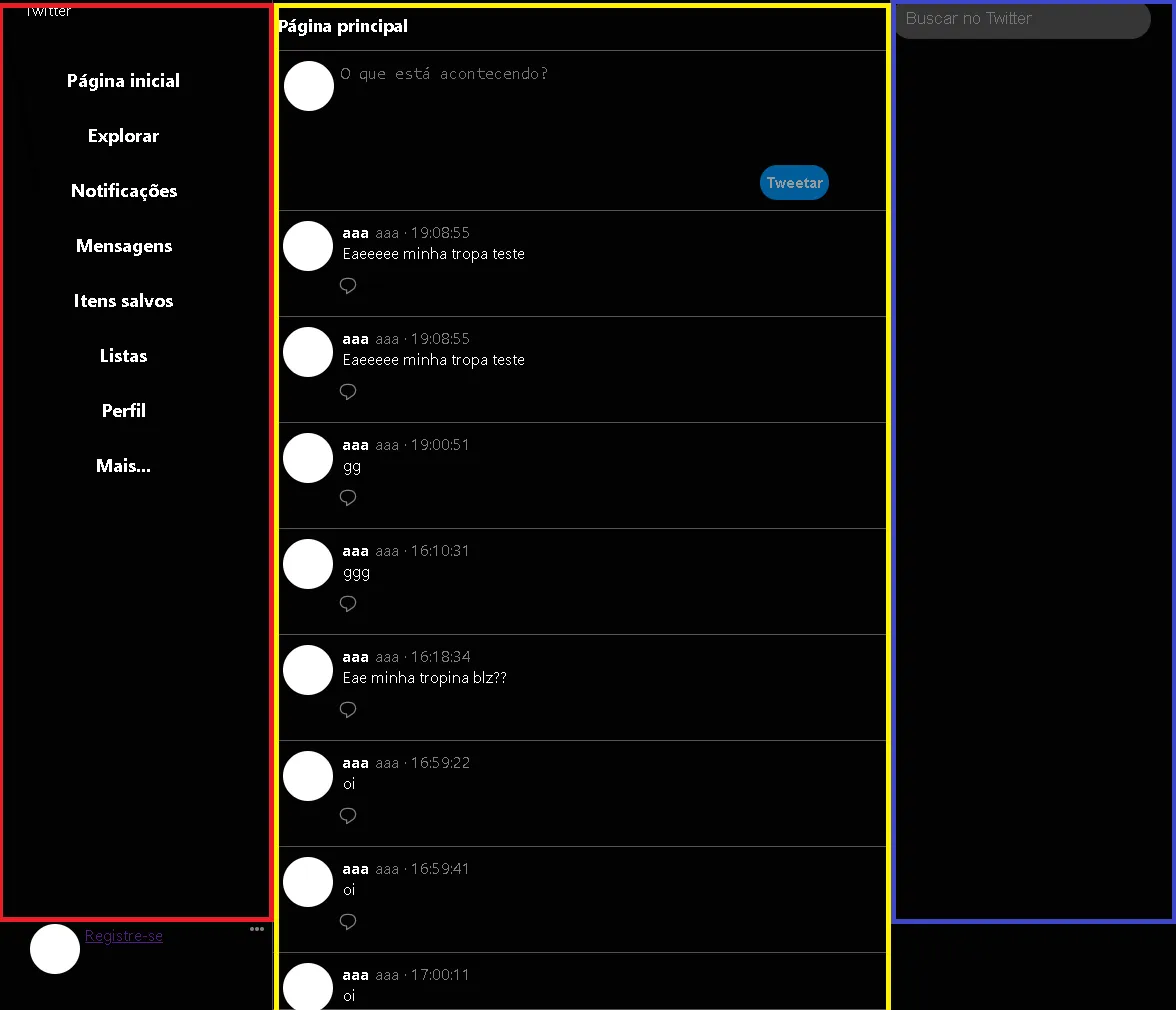 O objetivo é: ao rolar a tela, só a div em amarelo deve ser afetada. Usar overflow-y: scroll está fora de questão, pois o resultado não vai ficar bom e nem igual ao twitter verdadeiro.
