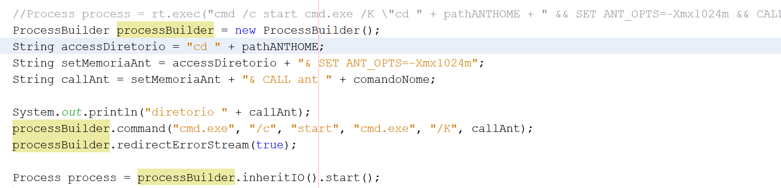 processBuilder.command(“cmd.exe”, “/c”, “start”, “cmd.exe”, “/K”, callAnt);