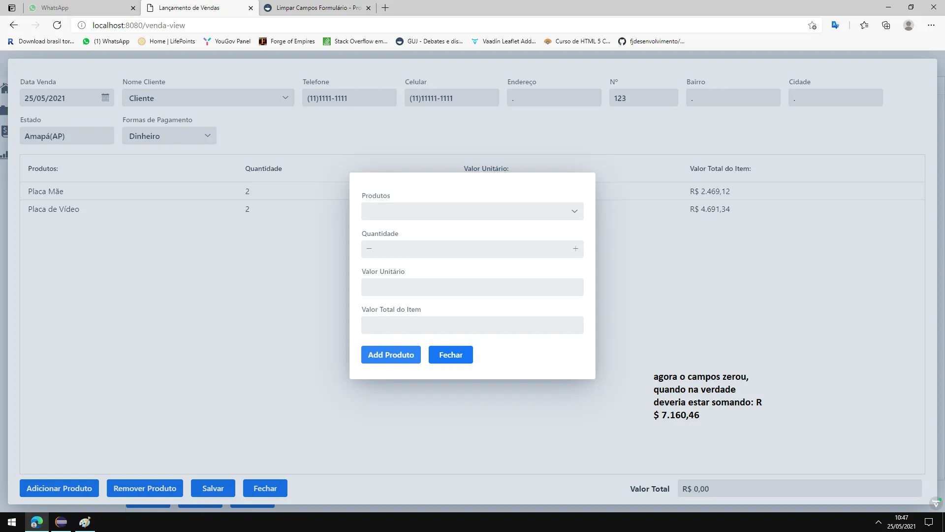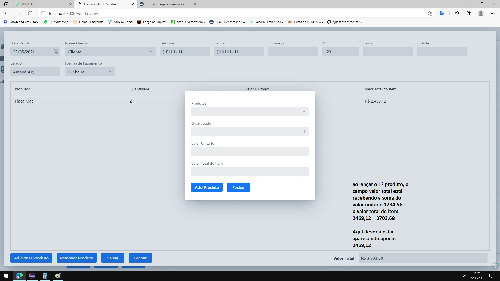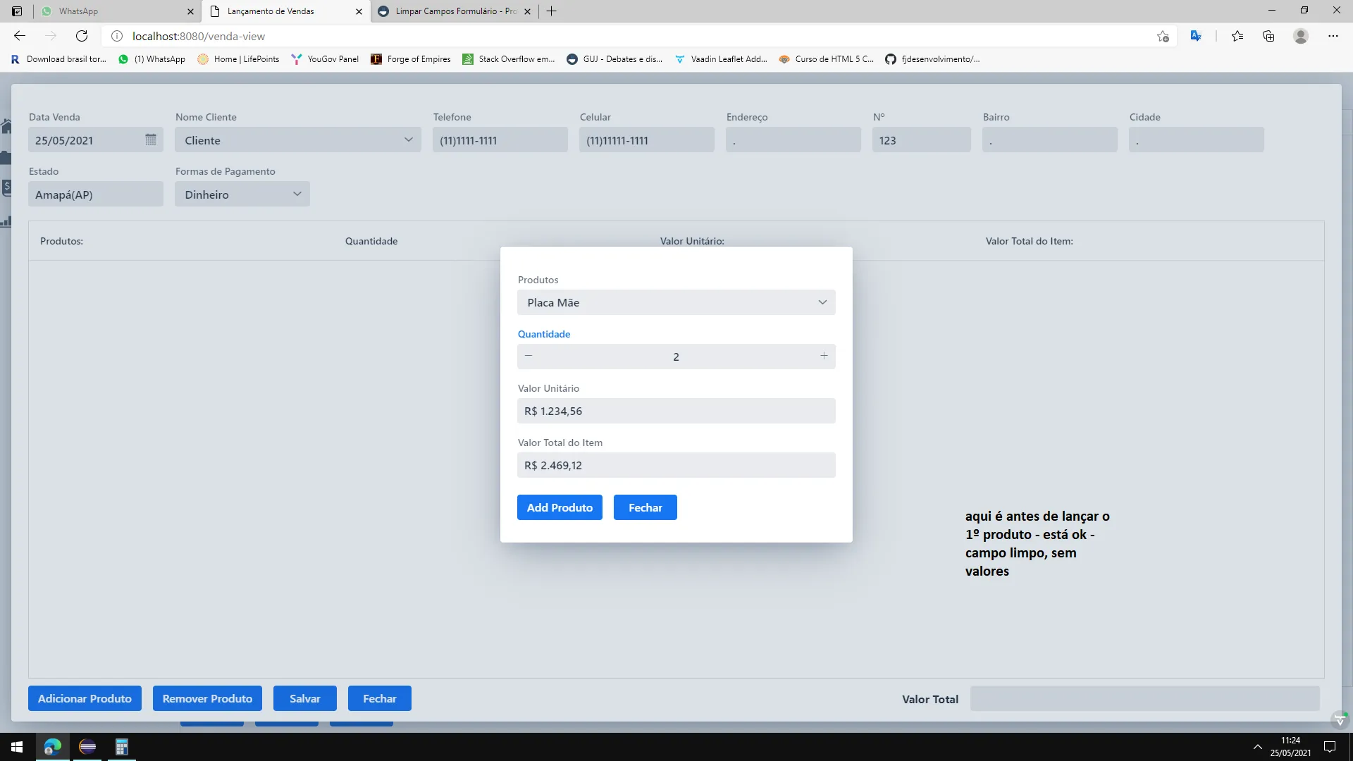 Mas após clicar em Add Produto, somente os campos produto e quantidade são limpos, o valor unitário e total do item permanecem com os dados: