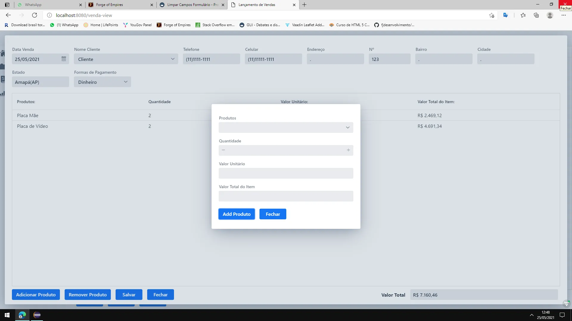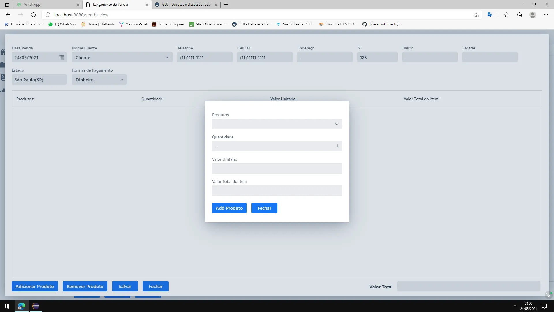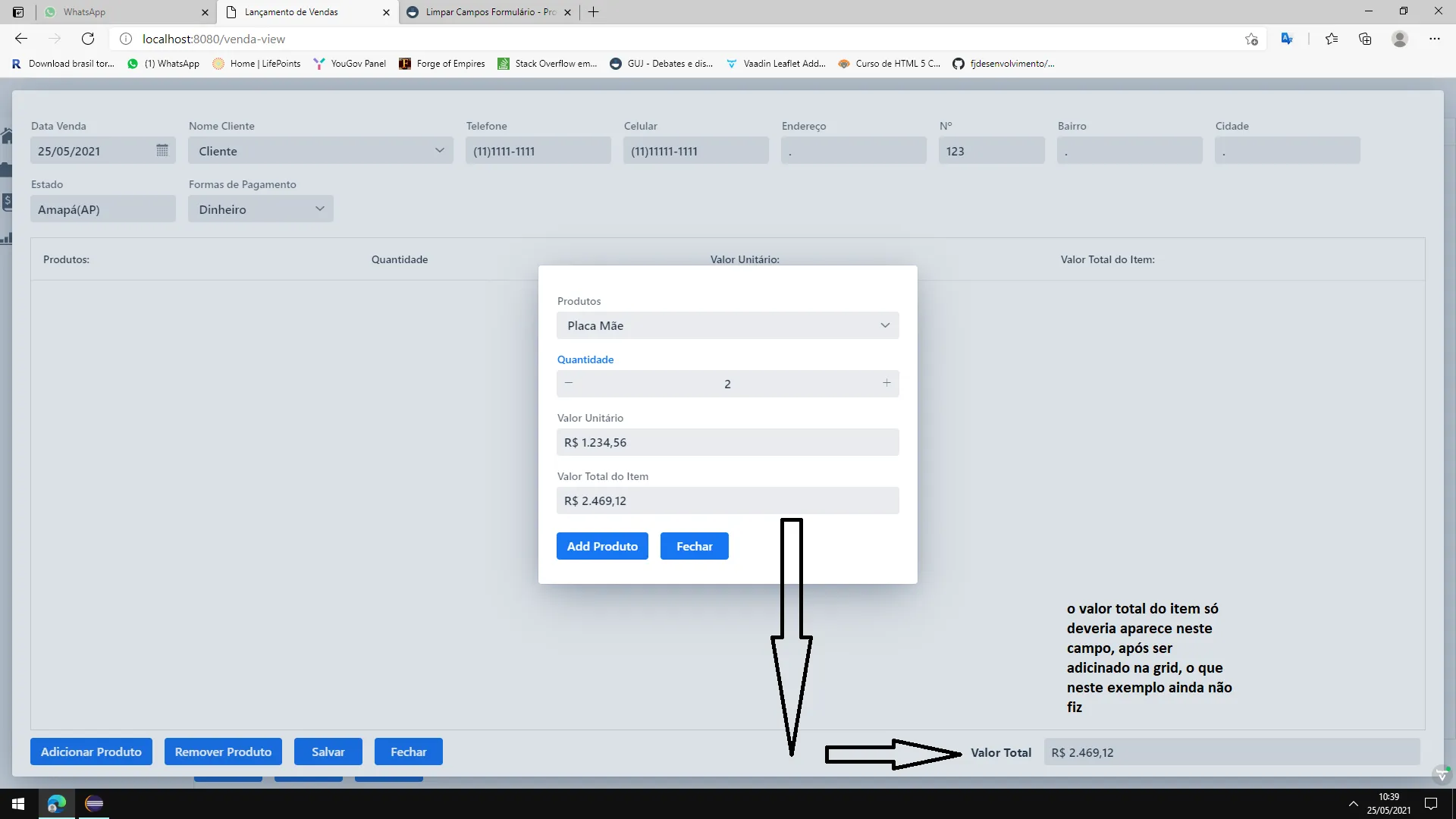 Mas após clicar em Add Produto, somente os campos produto e quantidade são limpos, o valor unitário e total do item permanecem com os dados: