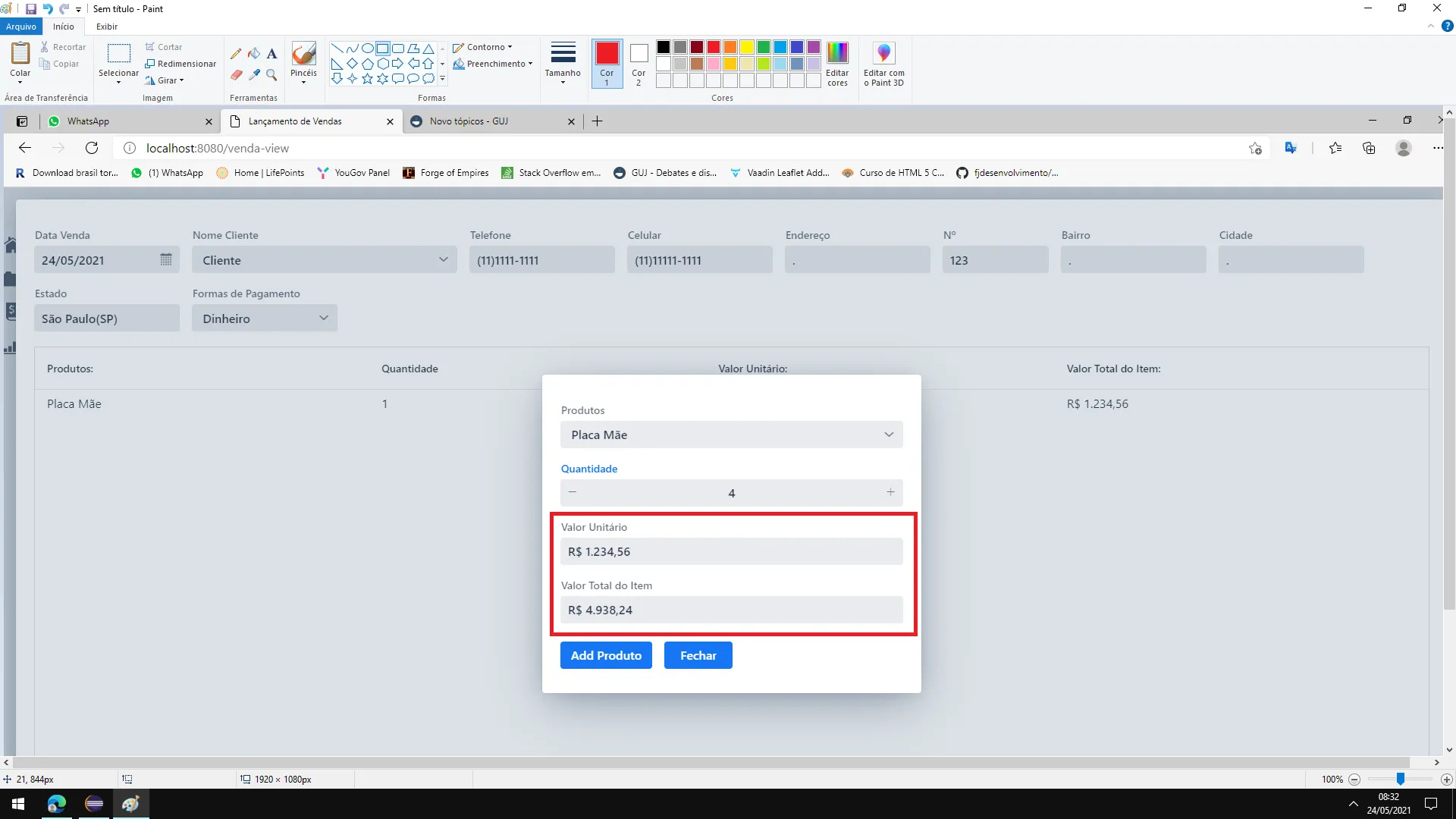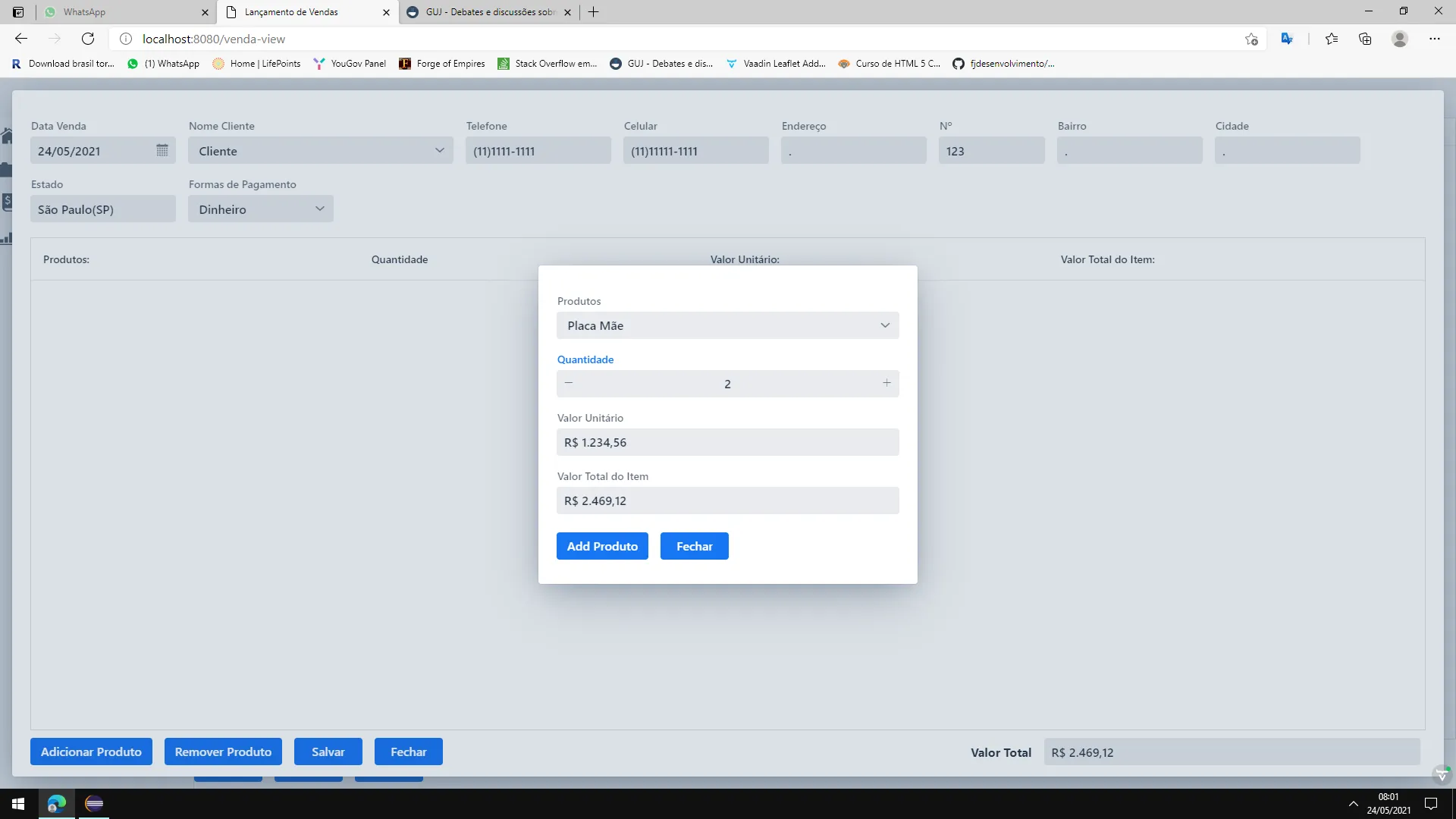 Nesta segunda janela tem um comboBox para selecionar o produto, um NumberField para definir a quantidade, o valor unitario é preenchido automaticamente no momento em que o produto é escolhido, e o valor total do item faz automaticamente a multiplicação entre quantidade e unitario.