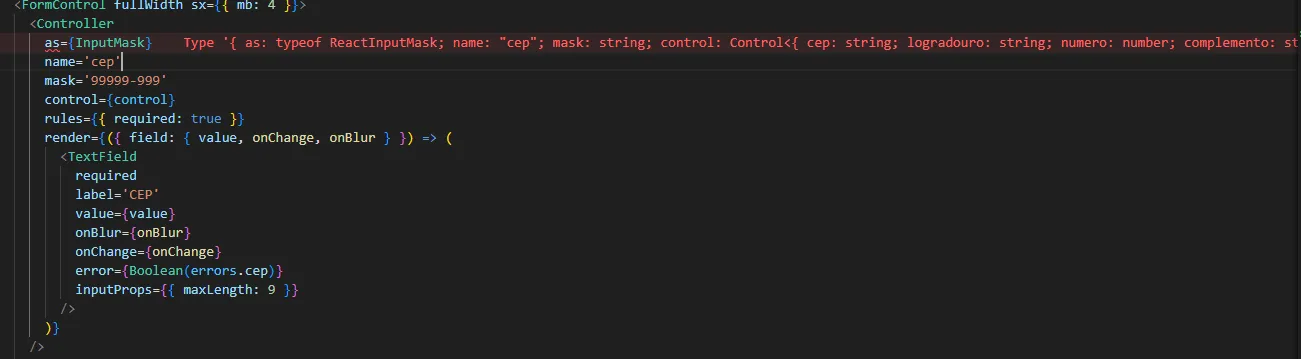 Type ' { as : typeof ReactInputMask ; name : "cep" ; mask : string ; control : Control <{ cep : string ; logradouro : string ; numero : number ; complemento : string ; estado : string ; bairro : string ; cidade : string ; }, any >; rules : { ... ; }; render : ({ field : { value , onChange , onBlur } }: { ... ; }) => Element ; } ' is not assignable to type ' IntrinsicAttributes & { render : ({ field , fieldState , formState , }: { field : ControllerRenderProps <{ cep : string ; logradouro : string ; numero : number ; complemento : string ; estado : string ; bairro : string ; cidade : string ; }, "cep" >; fieldState : ControllerFieldState ; formState : UseFormStateReturn < ... >; }) => ReactElemen ... ' .