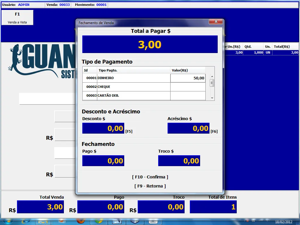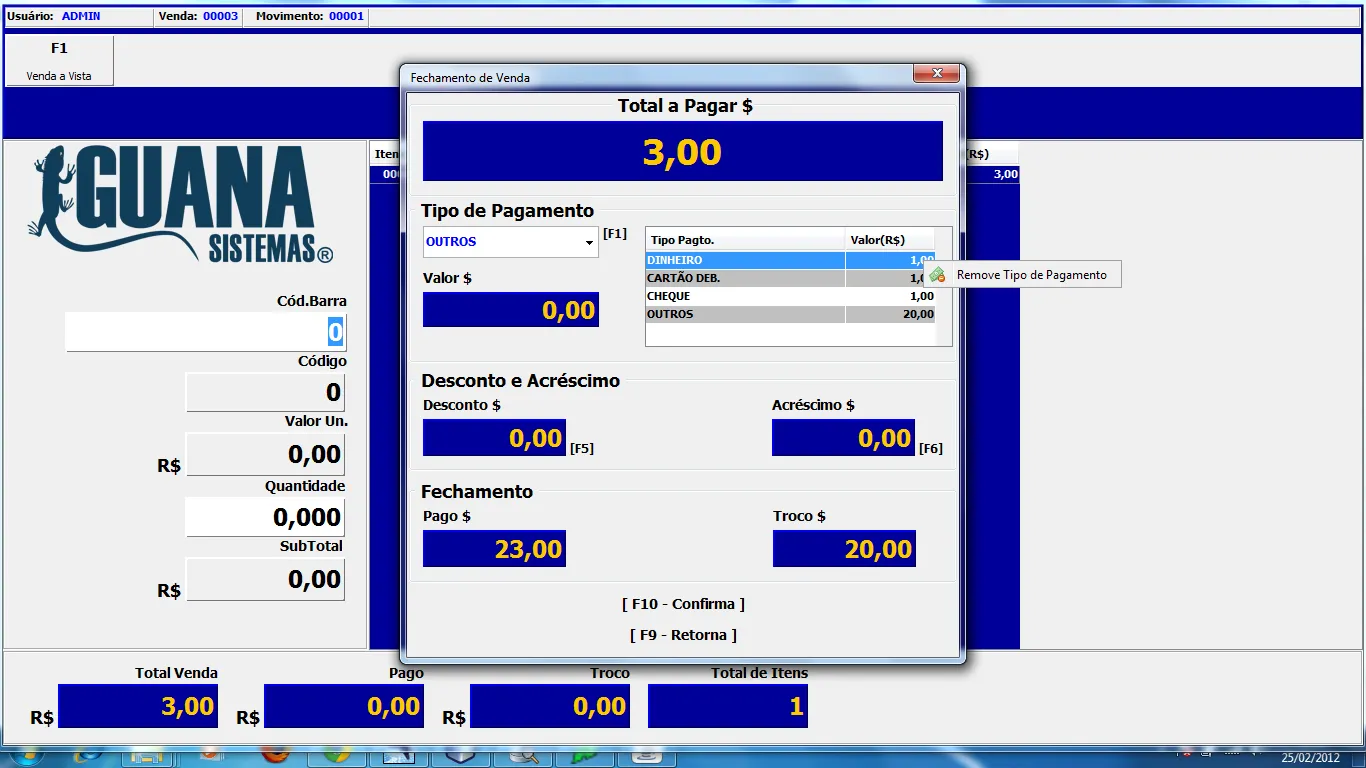 Nela há uma tabela onde você vai cadastrando quais os pagamentos para esta venda. Então, no topo você tem o número da venda e, abaixo, um botão para “Adicionar pagamento”, seguido da tabela que exibe estes dados. Ao clicar no botão “Adicionar pagamento”, abre um formulário que te mostra qual o valor restante para pagar e quais as formas de pagamento. Confirmando, os dados são adicionados na tabela.