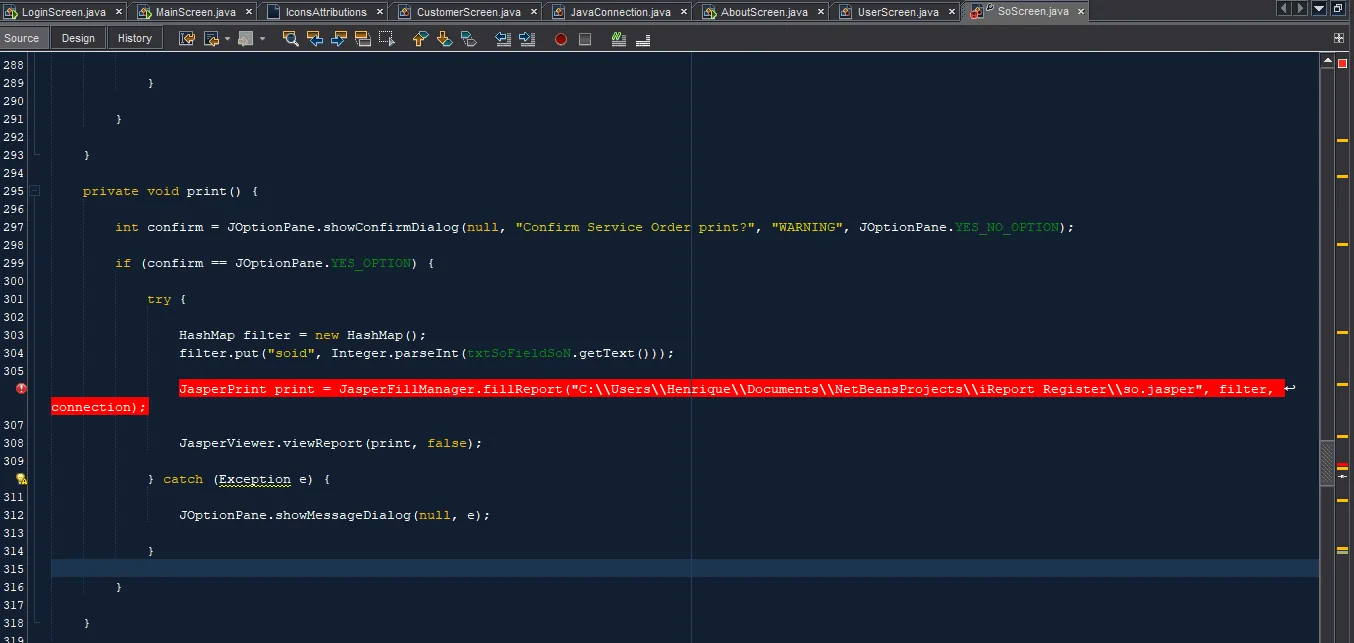 Olá comunidade programadora, estou perto de finalizar este projeto de aplicativo CRUD de Ordens de Serviços, feito em JDK 8, NetBeans 8.2, integração com banco de dados MySql e desenvolvimento de relatório de ordens de serviço com IReport Designer 5.6.0 com JDK 7.8;