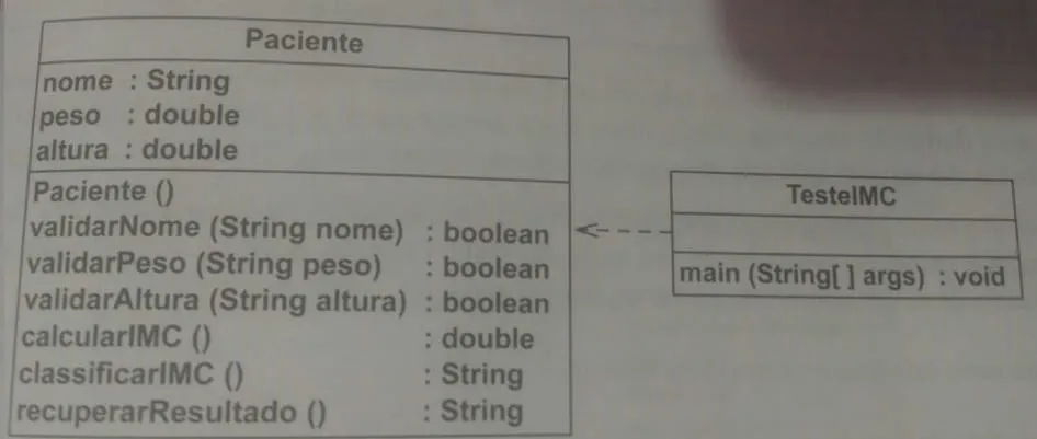 publicstaticvoidmain(String[]args){Pacientepaciente=newPaciente();Stringnome,peso,altura;doubleimc;while(true){while(true){nome=JOptionPane.showInputDialog(null,"Nome do paciente");if(nome==null){break;}if(paciente.validarNome(nome)){paciente.nome=nome.trim();break;}else{JOptionPane.showMessageDialog(null,"Nome inválido","Erro",0);}}if(nome==null){break;}while(true){peso=JOptionPane.showInputDialog(null,"Informe seu peso");if(peso==null){break;}if(paciente.validarPeso(peso)){paciente.peso=Double.parseDouble(peso);break;}else{JOptionPane.showMessageDialog(null,"Peso inválido!","ERRO",0);}}if(peso==null)break;;while(true){altura=JOptionPane.showInputDialog(null,"Infome a altura");if(altura==null){break;}if(paciente.validarAltura(altura)){paciente.altura=Double.parseDouble(altura);break;}else{JOptionPane.showMessageDialog(null,"Altura inválida","ERRO",0);}}if(altura==null)break;JOptionPane.showMessageDialog(null,paciente.recuperarResultado());}}
