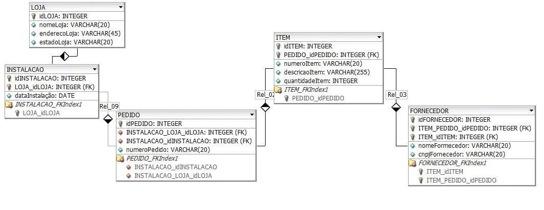 O que eu queria: Cada loja, tem “n” instalações. Cada instalação tem “n” pedidos. Cada pedido “n” itens e cada item “n” fornecedores. Todas a relações que criei foi de 1:N . Abaixo está o desenho das relações. Se puderem em dizer se o caminho é esse, agradeceria pela ajuda. obrigada.