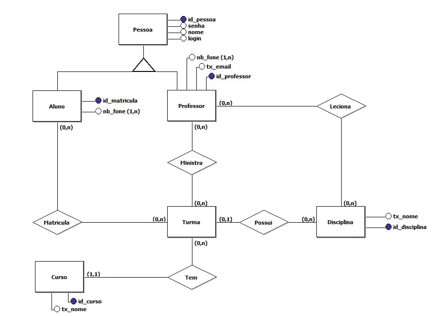 Pessoal alguém poderia me ajudar? Estou fazendo um trabalho de banco de dados no qual tenho que fazer um “sistema” acadêmico, desenvolvi esse ER da foto, tenho duvidas: Como faço para o professor armazenar as notas e frequências ? Como faço para o aluno visualizar essas notas e frequências?