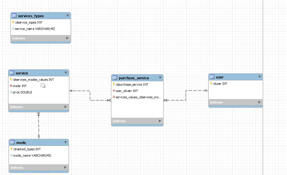 Desse tipo que passei, já eh uma tabela nova (Service_Mode). Nela teria a FK do Service e do Mode. Não seria mais necessário ter o id do mode na sua tabela de service.