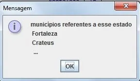 JOptionPane.showMessageDialog(null,"municipio"+ r[i].getNomeMunicipioRegiao());
