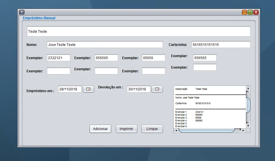 jPanel1 = new javax.swing.JPanel(); txtCarterinha = new javax.swing.JTextField(); txtExe1 = new javax.swing.JTextField(); txtExe2 = new javax.swing.JTextField(); txtExe5 = new javax.swing.JTextField(); txtExe6 = new javax.swing.JTextField(); txtExe8 = new javax.swing.JTextField(); txtExe7 = new javax.swing.JTextField(); txtExe3 = new javax.swing.JTextField(); jLabel1 = new javax.swing.JLabel(); jLabel2 = new javax.swing.JLabel(); jLabel3 = new javax.swing.JLabel(); jLabel4 = new javax.swing.JLabel(); jLabel5 = new javax.swing.JLabel(); jLabel6 = new javax.swing.JLabel(); jLabel7 = new javax.swing.JLabel(); jLabel8 = new javax.swing.JLabel(); jLabel9 = new javax.swing.JLabel(); jLabel10 = new javax.swing.JLabel(); txtNome = new javax.swing.JTextField(); btnImprimir = new javax.swing.JButton(); jLabel11 = new javax.swing.JLabel(); jLabel12 = new javax.swing.JLabel(); txtExe4 = new javax.swing.JTextField(); txtObservacao = new javax.swing.JTextField(); DataEmprestimo = new com.toedter.calendar.JDateChooser(); DataDevolucao = new com.toedter.calendar.JDateChooser(); btnAdicionar = new javax.swing.JButton(); btnLimpar = new javax.swing.JButton(); jScrollPane2 = new javax.swing.JScrollPane(); txtRecebe = new javax.swing.JTextArea();