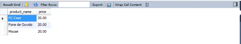 INSERTINTOBDGUI.products(product_name,product_type,price)VALUES("Mouse",'A',20.00),("Fone de Ouvido",'A',20.00),("Monitor",'B',530.50),("Cadeira de Jogos",'C',530.50),("PC Case",'A',20.00),("Mesa de Computador",'C',530.50);