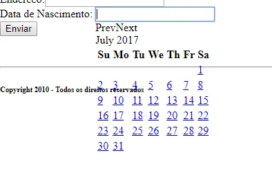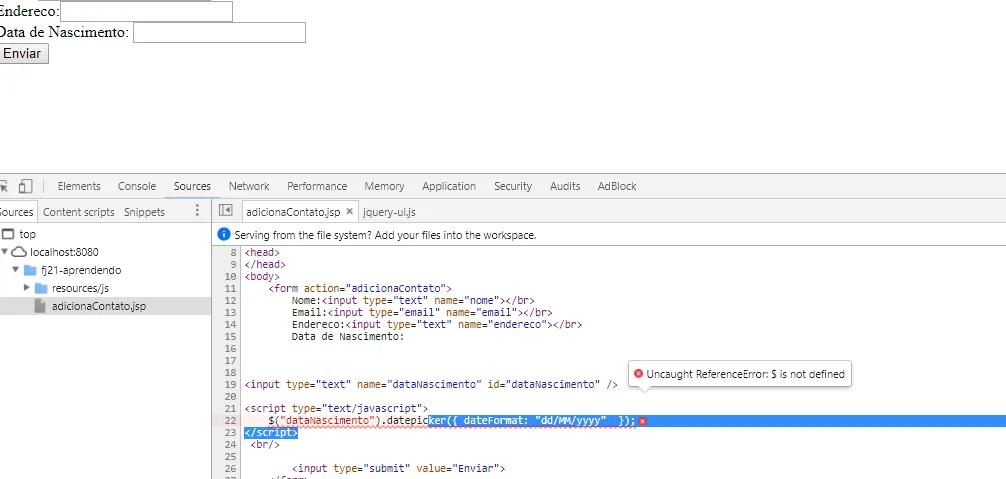 Data de Nascimento: <caelum:campoDataid="dataNascimento"/><br/><inputtype="submit"value="Enviar"></form><scripttype="text/javascript"src="resources/js/jquery.js"></script><scripttype="text/javascript"src="resources/js/jquery-ui.js"></script></body></html>