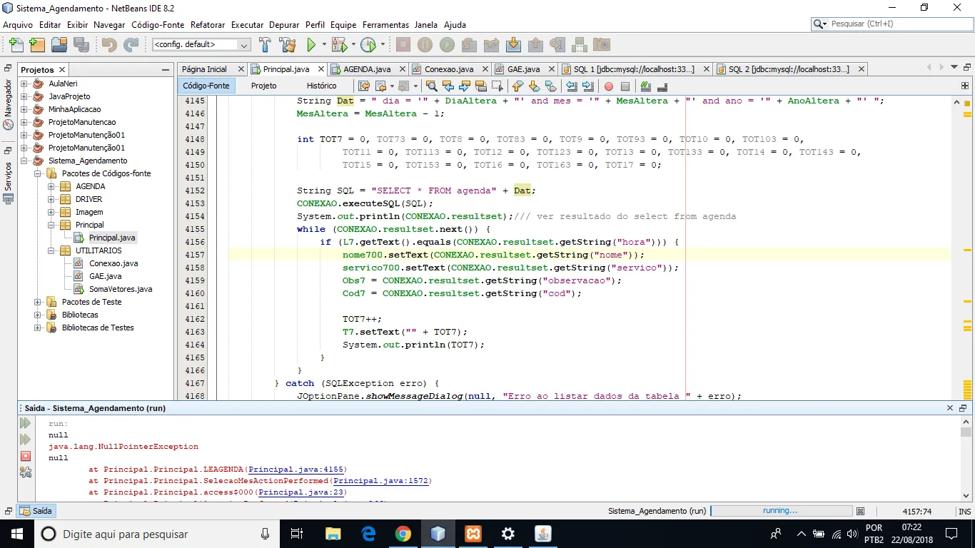 try{MesAltera=MesAltera+1;StringDat=" dia = '"+DiaAltera+"' and mes = '"+MesAltera+"' and ano = '"+AnoAltera+"' ";MesAltera=MesAltera-1;intTOT7=0StringSQL="select * from agenda where "+Dat;CONEXAO.executaSQL(SQL);while(CONEXAO.resulset.next()){if(L7.getText().equals(CONEXAO.resulset.getString("hora"))){nome700.setText(CONEXAO.resulset.getString("nome"));servico700.setText(CONEXAO.resulset.getString("servico"));Obs7=CONEXAO.resulset.getString("observacao");Cod7=CONEXAO.resulset.getString("cod");TOT7++;T7.setText(""+TOT7);}}}catch(SQLExceptionerro){JOptionPane.showMessageDialog(null,"Erro ao listar dados da tabela "+erro);}catch(Exceptionerr){System.out.println(err);}