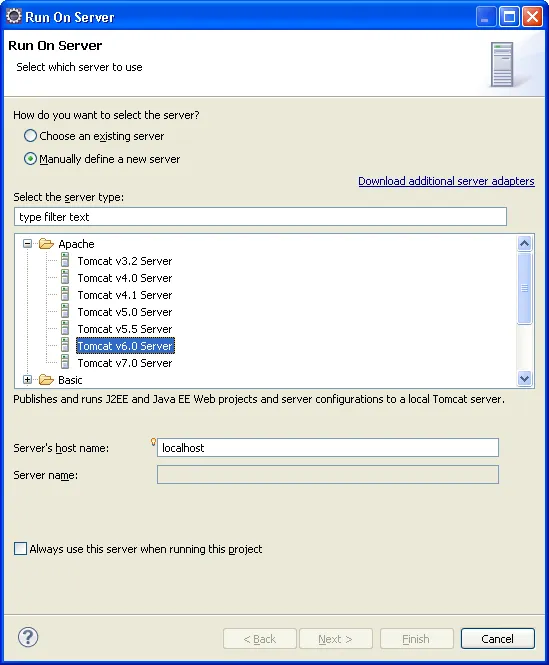 Clica em Choose an existing server, e tenta ver por ali.Exato!Se nao der, clica em Download additional server adapter, e verifica se tem como baixar um driver melhor e mais atual, ou correspondente ao seu tomcat.
