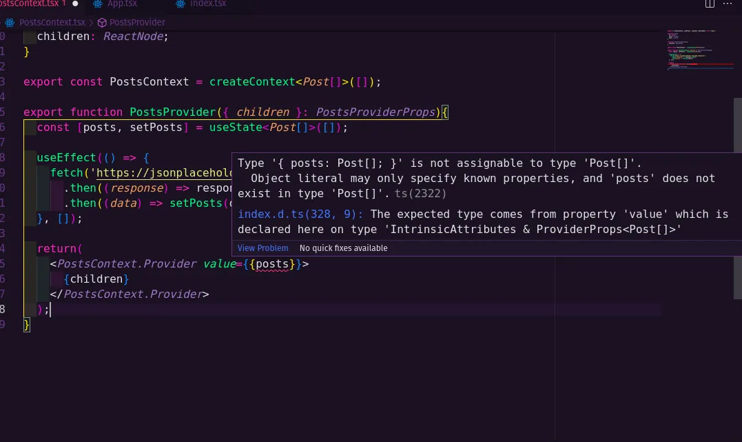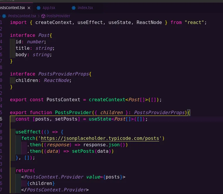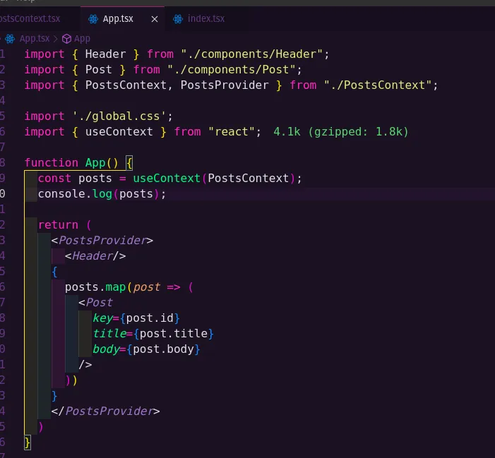Eu tenho um contexto chamado posts, e ele deveria mostrar os dados vindo da API no arquivo que eu chamar ele, porém se eu dou um console.log no state dentro do arquivo de contexto ele tá mandando os dados da API pra lá, porém seu eu dou um console.log no arquivo não qual eu quero usar o contexto, ele mostra um array vazio. Segue abaixo as imagens para vocês situarem.