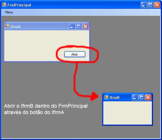 O IfrmA tem um botão. Eu preciso fazer uma chamada ao IfrmB deste botão do IfrmA e abrir o IfrmB dentro do FrmPrincipal. Confuso neh? heheh. Segue a imagem para explicar melhor.