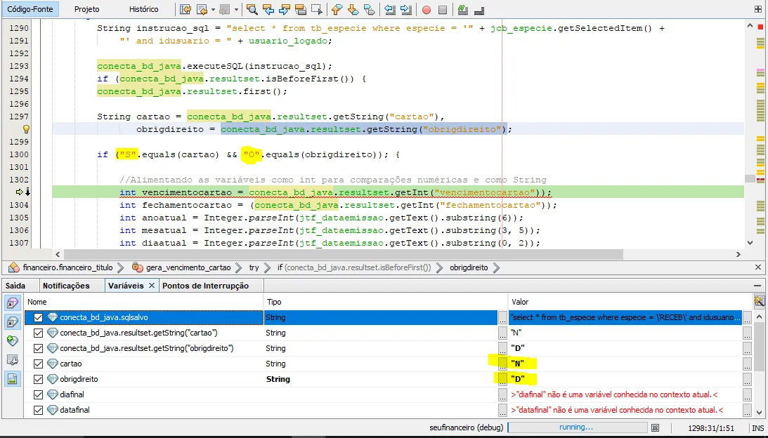 Alguém já pegou essa doideira do Netbeans? Eu quero que ele faça algo somente se a variável obrigdireito for O e a variável cartao for S. Mas mesmo as variáveis sendo diferentes ele está entrando no if. Fiz o select direto no banco e as colunas realmente estão diferentes, conforme estão no print abaixo.